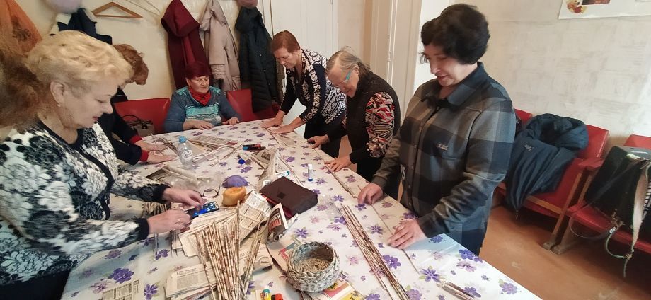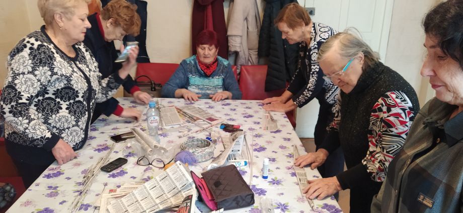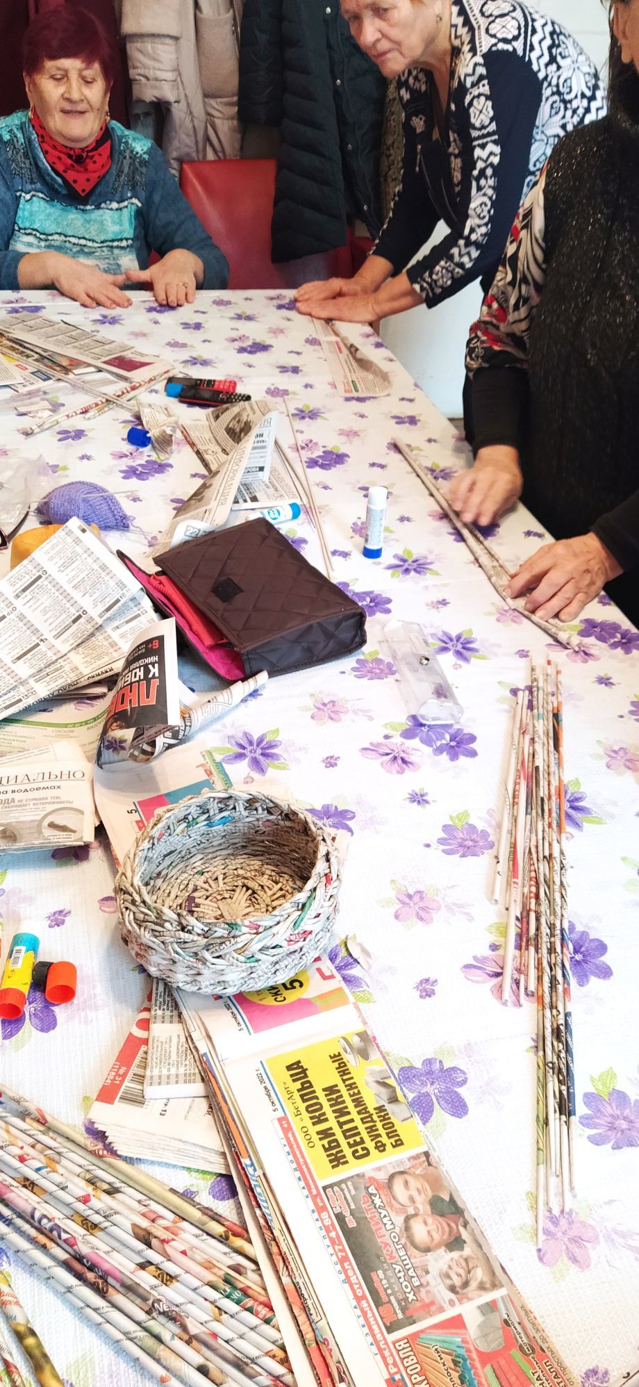 Группа активистов ветеранской организации Юргинторга заслуживает особого восхищения – их интересы весьма разнообразны. В этот раз они собрались клубом «Своими руками», чтобы научиться изготавливать плетеные корзиночки, вазочки или шкатулки. Такие изделия вполне годятся в качестве подарка или сувенира, а для их изготовления используются самые простые подручные материалы. В данном случае «сырьем» послужили листы старых газет. Когда изделие принимает желаемую форму, его можно раскрасить веселыми цветами красок.